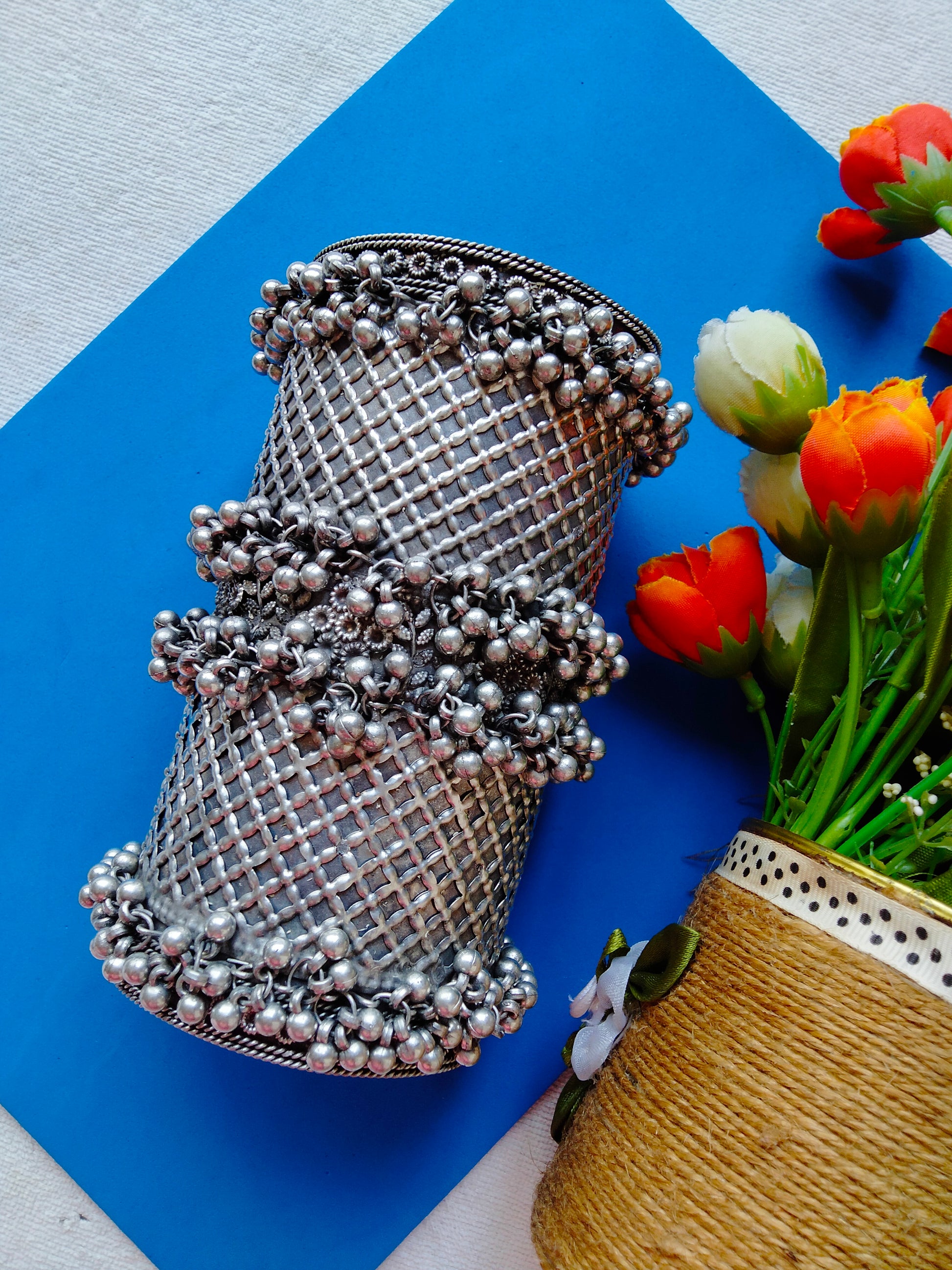 Adorn your wrist with this stunning set of handcrafted cuff bracelets. Each cuff is meticulously polished to a deep black shine, featuring intricate floral and tribal-inspired patterns that stand out beautifully against the dark finish. The detailed craftsmanship gives these cuffs a rich, antique look while the smooth, polished surface feels comfortable on your skin.