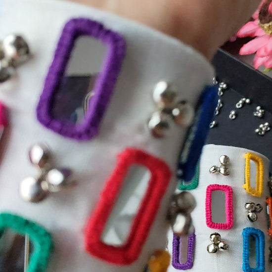 This White Mirror Handcuff is 100% hand crafted by skilled artisans, honoring the rich traditions of Indian craftsmanship. - The intricate mirror work captures light beautifully, showcasing timeless elegance and cultural heritage. - Designed to complement both traditional and modern attire with a sophisticated touch.