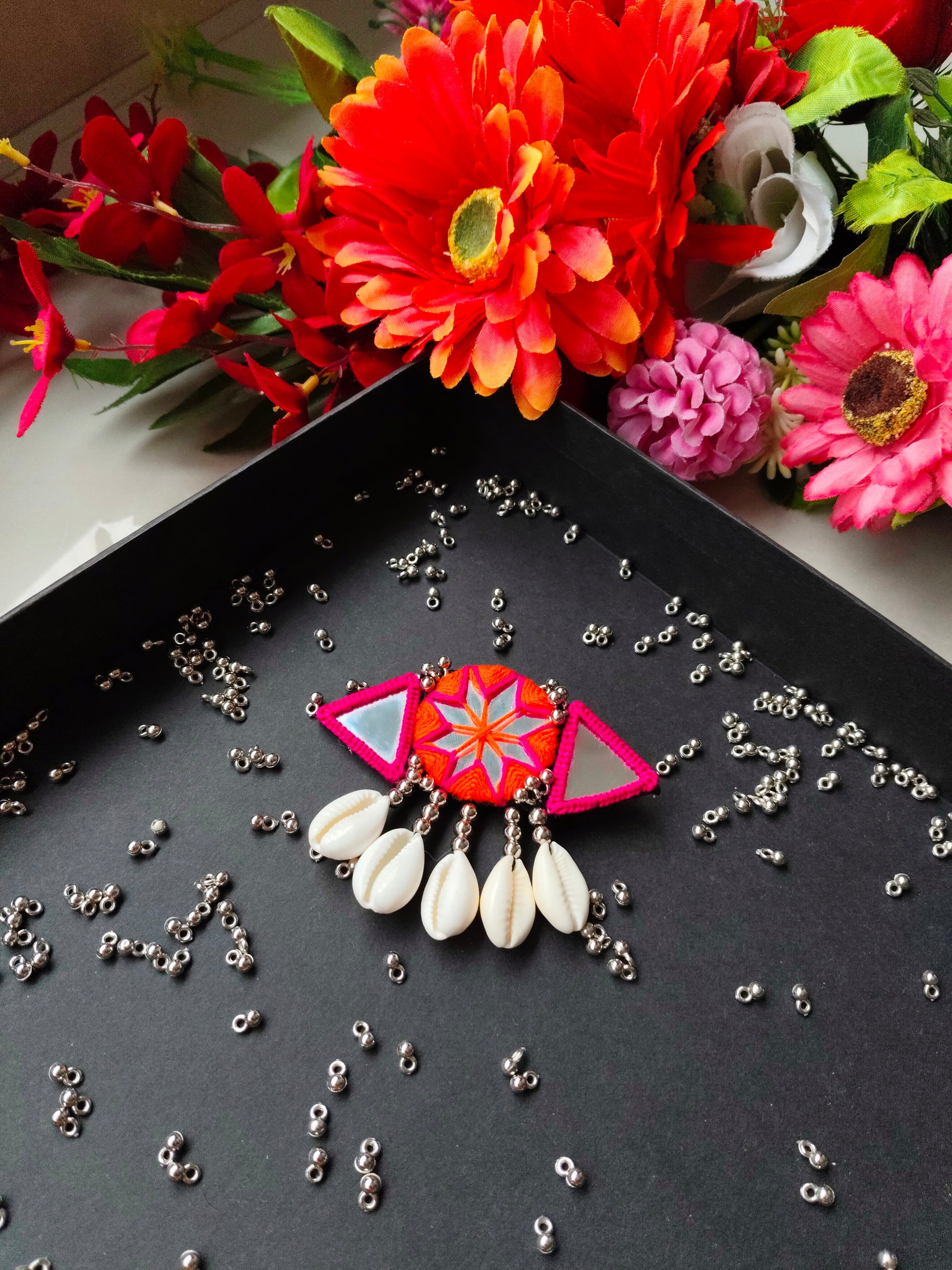 • Design: A handcrafted hairpin featuring a meticulously embroidered rhombus with a central star motif in rich red and white thread. The piece is accented with two tiny mirrors for a reflective shimmer.