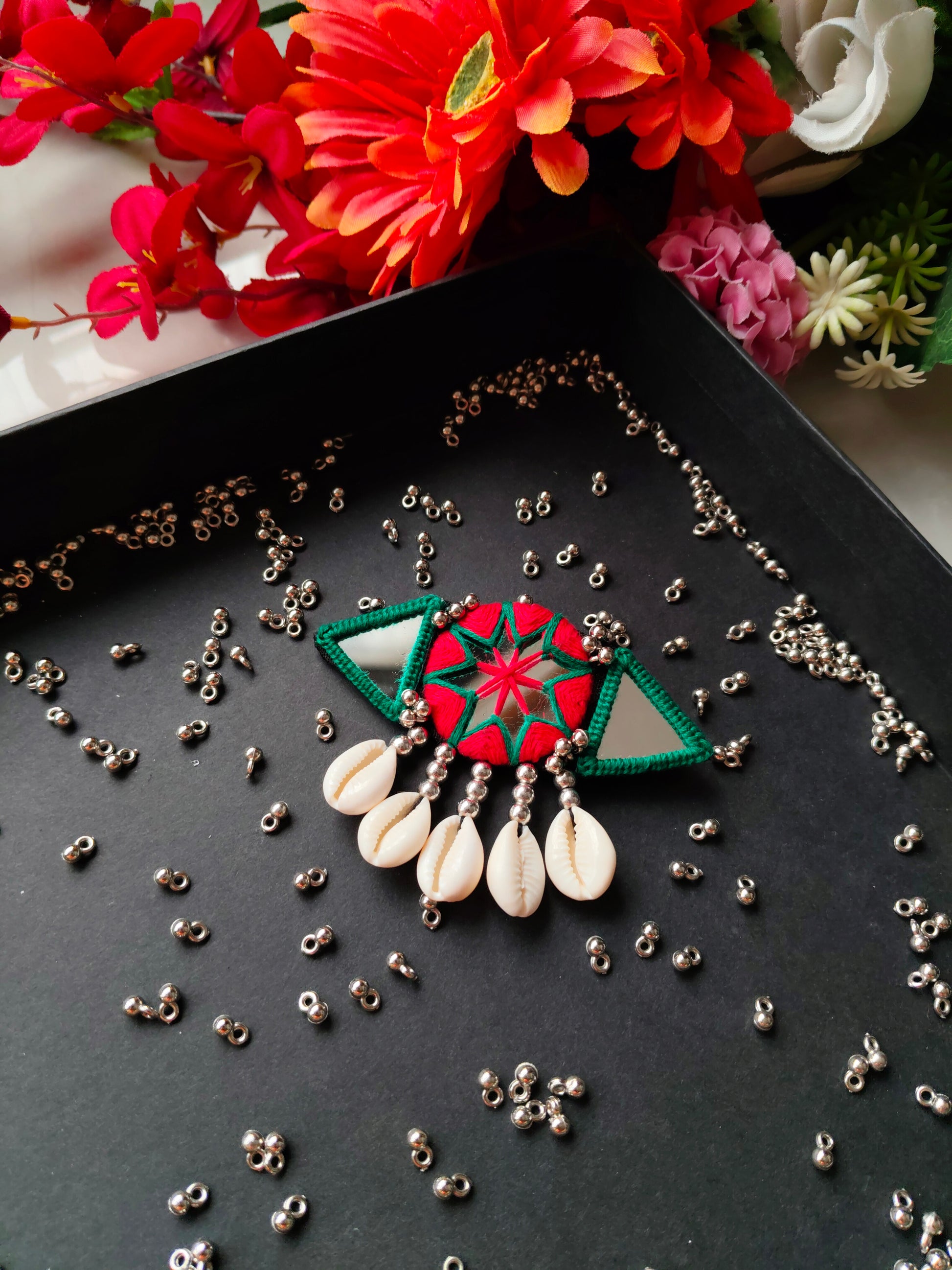 Design: A handcrafted hairpin featuring a meticulously embroidered rhombus with a central star motif in rich red and white thread. The piece is accented with two tiny mirrors for a reflective shimmer.