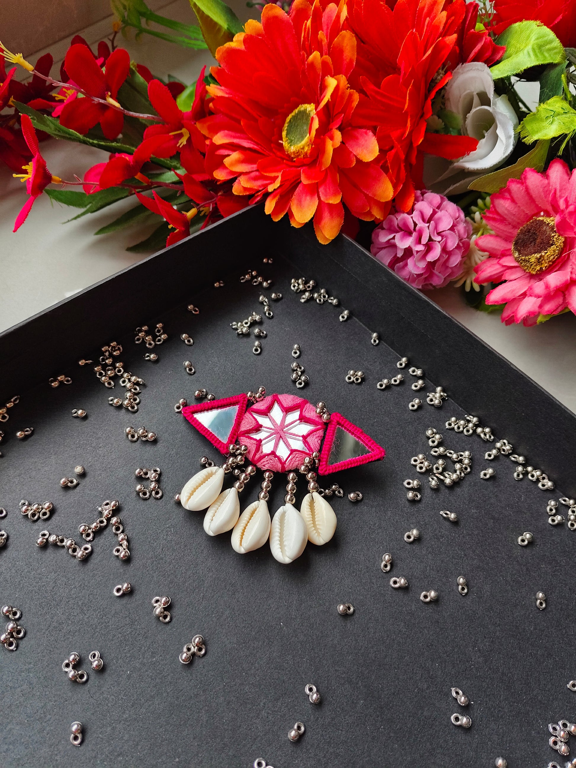 • Design: A handcrafted hairpin featuring a meticulously embroidered rhombus with a central star motif in rich red and white thread. The piece is accented with two tiny mirrors for a reflective shimmer.