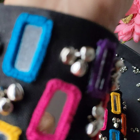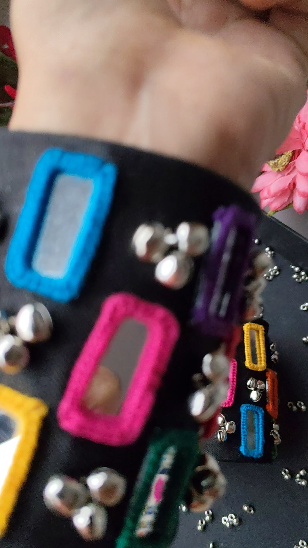 This Black Mirror Handcuff is 100% hand crafted by skilled artisans, honoring the rich traditions of Indian craftsmanship. - The intricate mirror work captures light beautifully, showcasing timeless elegance and cultural heritage. - Designed to complement both traditional and modern attire with a sophisticated touch.