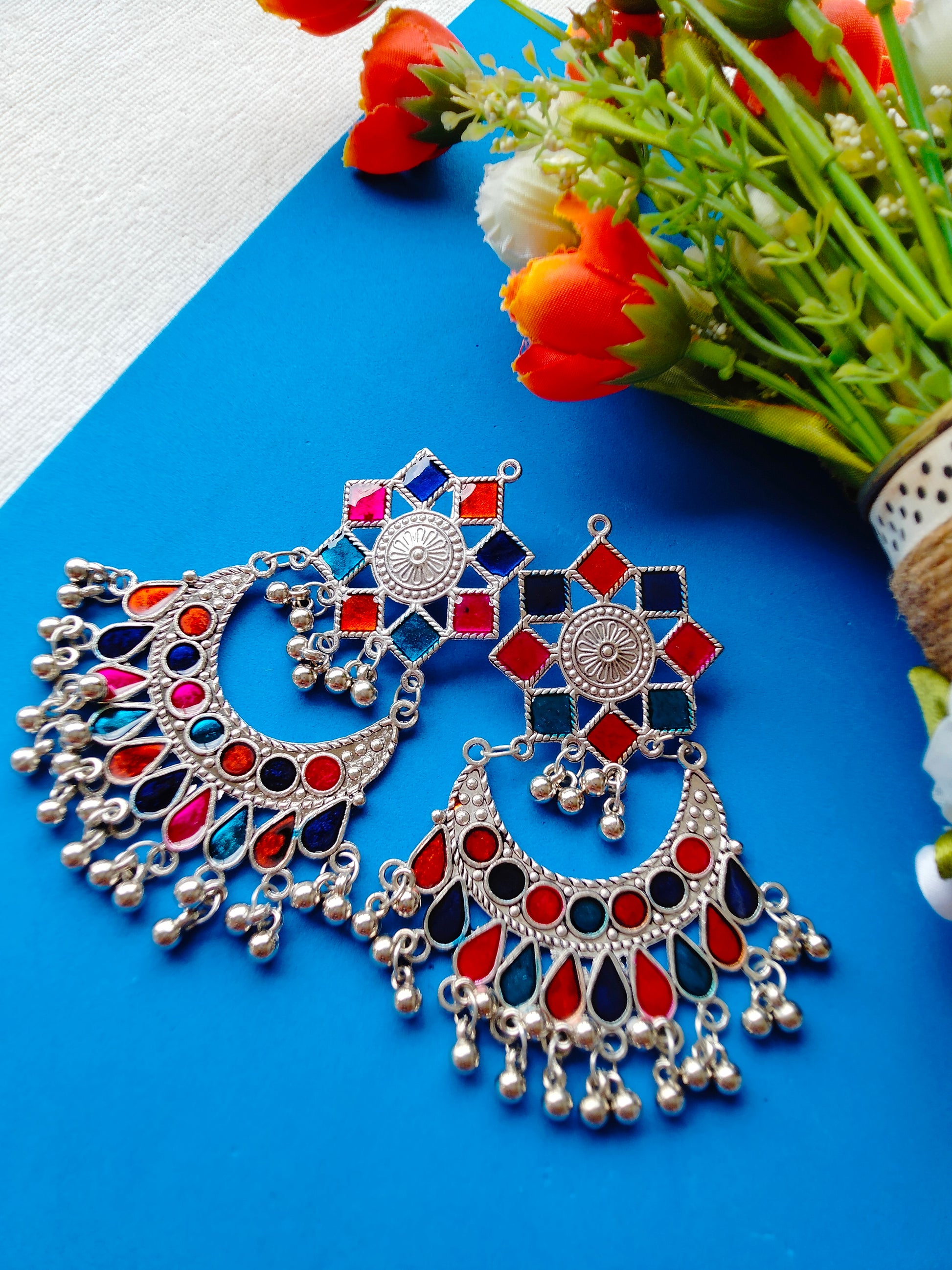 The intricate design features a central floral motif with a unique, star-shaped pattern at its core, from which hangs a series of elegant chains. Each petal of the flower is beautifully inlaid with a faceted, colorful stone—in shades of red, blue, green, and pink—adding a pop of striking color. The earrings are finished with delicate ghungroo bells at the end of each chain, which produce a soft, melodic sound with every movement.