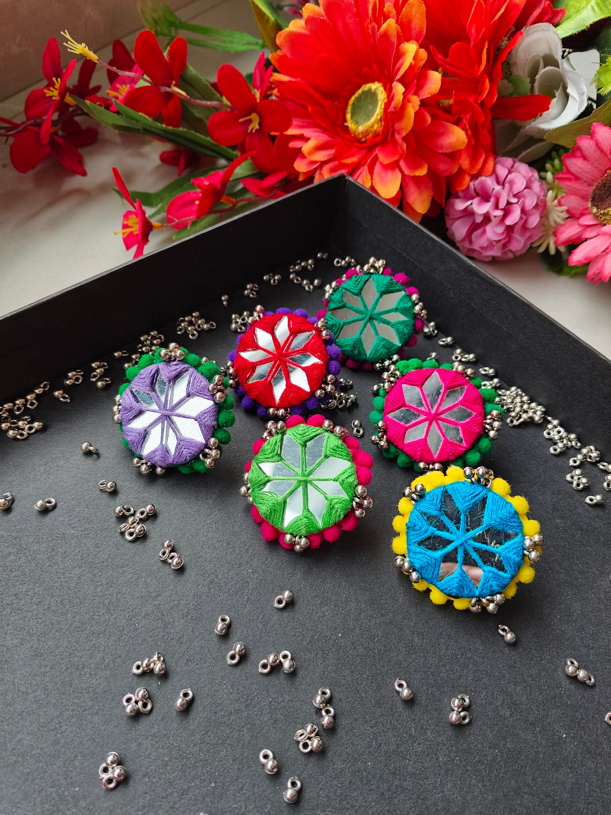 Adorn your fingers with our exquisite mirror rings, a stunning blend of traditional craftsmanship and vibrant design. Each ring features a captivating faceted mirror at its center, surrounded by intricate, multi-colored thread work and delicate metallic beads.